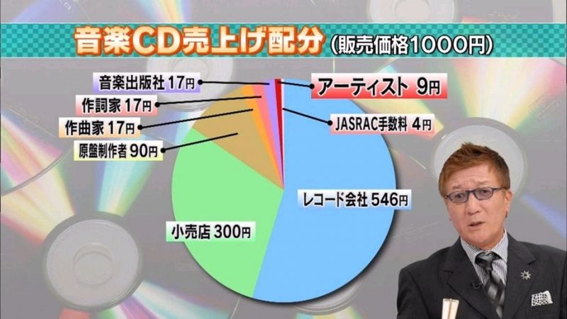 宣伝費・スタジオ代・CD作る実費・売れなかった場合の損失もレコード会社持ちだから実際のほぼ全て利益になるアーティストと取り分はまるで違う。
