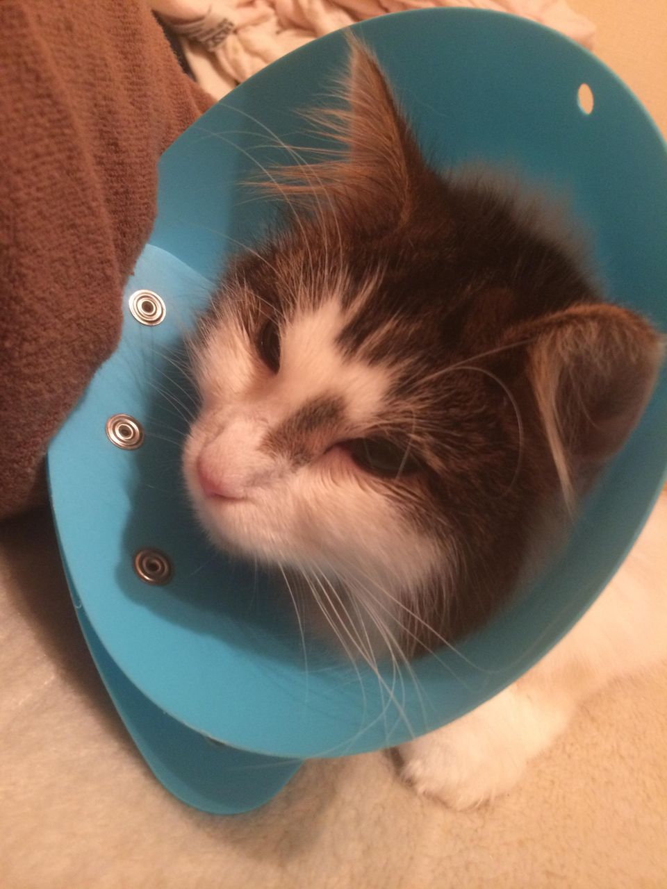 首の周りに付けてる水色のがエリザベスカラーっていうんやで